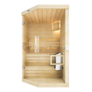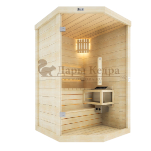 Это специально оборудованная готовая деревянная кабина для сухого и влажного парения. Электропечь нагревает пространство внутри и позволяет сбрызгивать камни водой, слегка увлажняя воздух. Такая процедура позволяет избежать перегрева. Каркас сауны выполнен из массива кедра, снаружи и внутри обшит липовой вагонкой сорта «Экстра» и имеет теплоизоляционный слой. Также двухуровневый полок идёт из кедра для обогащения внутри кабины полезными фитонцидами, а в сочетании с противовирусными свойствами липы сауна становится настоящим источником здоровья.
