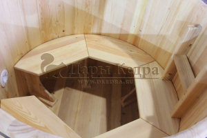 Это герметичная емкость для воды из кедра, которая предназначена для отдыха и охлаждения тела после процедур парения. Благодаря круглой форме, купель хорошо впишется в любое помещение. Так же подойдет для установки на открытом воздухе. Для удобства пользования оснащена лавочками, приставной и внутренней лестницей из кедра. За счет стяжных болтов обручи из нержавеющей стали плотно прилегают к кедровой купели. Это позволяет равномерно распределять нагрузку воды и сохранить форму изделия в период эксплуатации. При правильном уходе круглая купель для бани не рассыхается и не подвергается гниению.