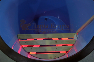 Эффектная подсветка, посредством встроенной, влагозащищённой светодиодной ленты класса IP68. Идеально подходит для круглых купелей. Источник света скрыт от глаз, яркость освещения и цвет можно менять с пульта на расстоянии до 5 метров. Также есть автоматический режим плавной смены цветов, похожий на северное сияние. Хотите удивить близких и друзей? Тогда это ваш вариант!