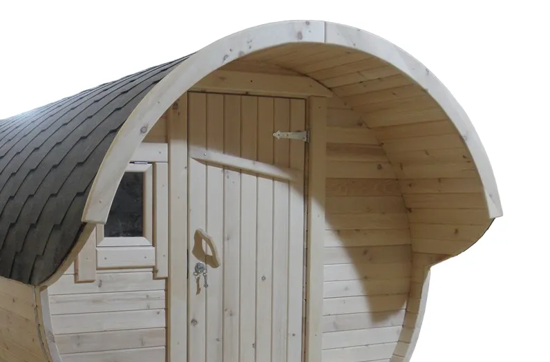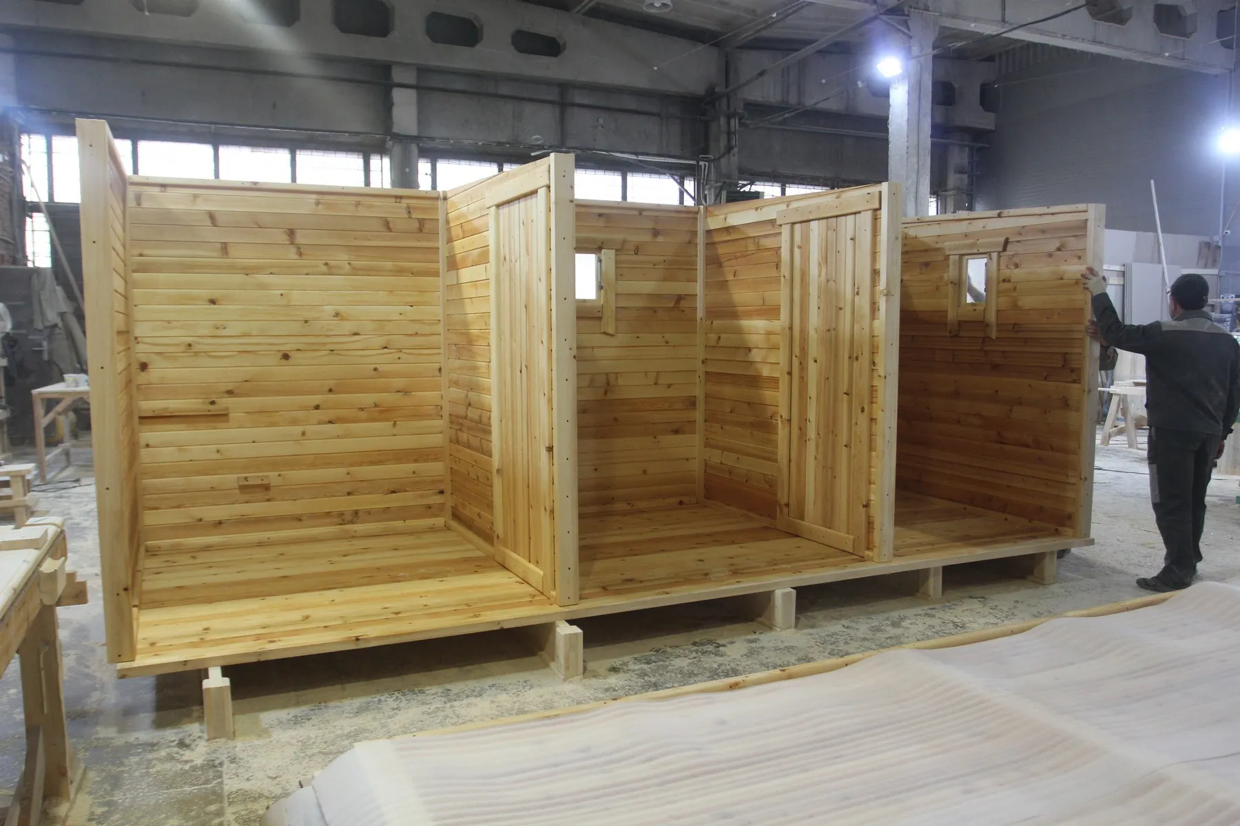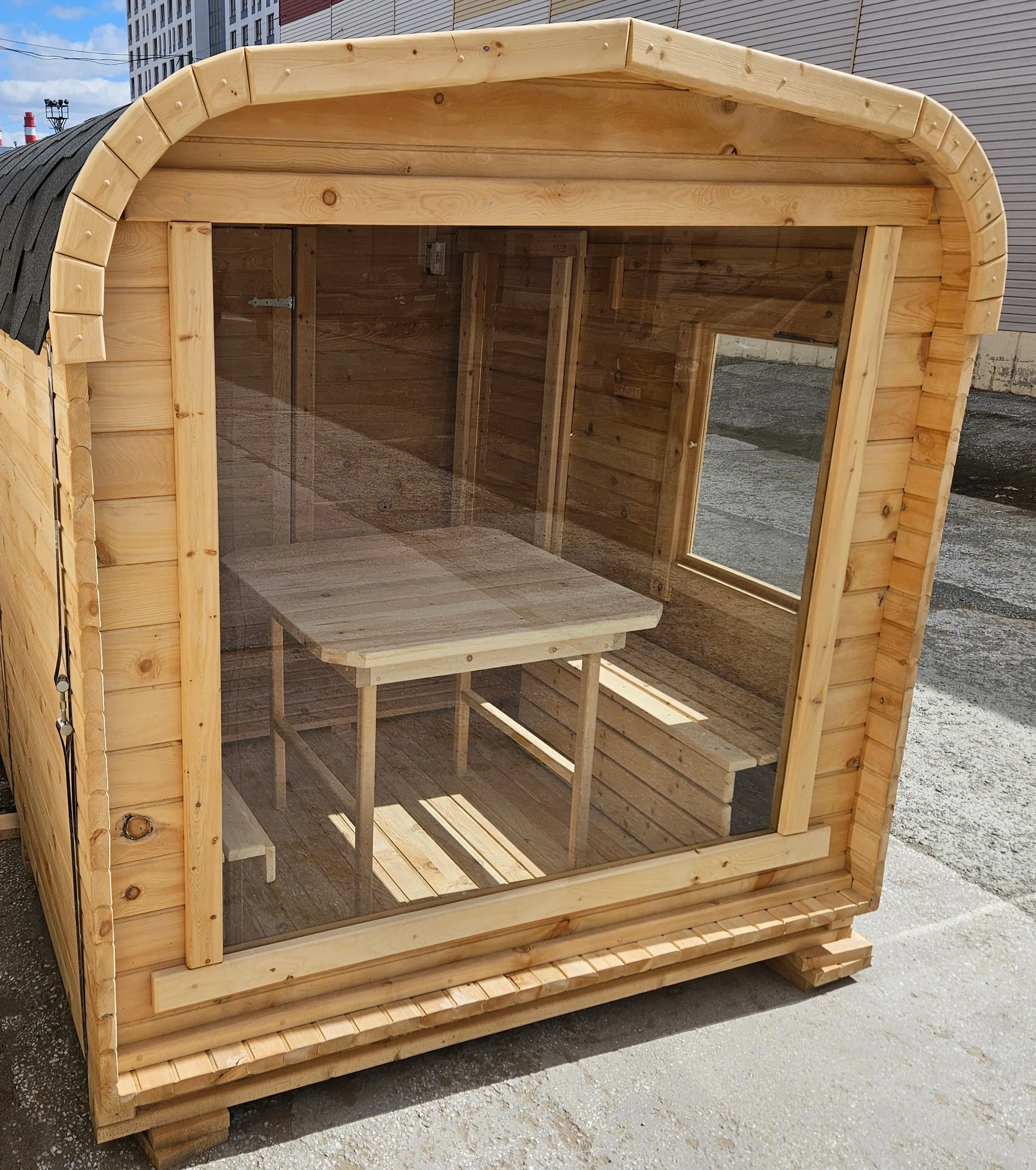 Домик с тремя помещениями подходит для дачного использования в теплое время года или обустройства загородных баз отдыха. Прихожая и кухня занимают одну комнату, в которой стоит стол из кедра. Две другие оборудованы четырьмя деревянными лежаками, по желанию их можно заменить на двуспальные кровати. Либо обустроить санузлом и душевой зоной. Для удобства пользования кемпинг дом можно укомплектовать верандой с лавочками или козырьком.