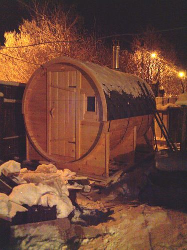 Баня бочка стоит уже полтора года, топка с наружи, нам такой вариант больше понравился, т.к. мусор от дров остается на улице. Всего 40 минут надо, чтоб в бане стало жарко. Паримся зимой и летом! Рекомендую.
